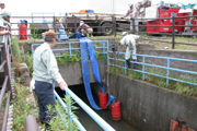 ポータブル式の排水ポンプが取り付けられた市内常盤台の米山台川 (2006/06/17)