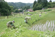 草刈り作業を進めるECHIGO棚田サポーター=市内高柳町門出の大開の棚田 (2006/06/19)