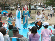 長岡・悠久山公園の花見で震災仮設住宅被災者らに馬頭琴などを披露した産大留学生 (2006/05/02)
