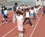 ジュニア陸上教室で、敏しょう性などを鍛えるラダートレーニング=市陸上競技場 (2006/05/08)