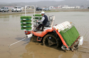 県内で一番早い新米を目指した越路早生の田植え=24日、市内上田尻 (2006/04/25)