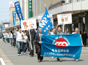 シュプレヒコールを上げながらデモ行進をする柏崎地区メーデーの参加者=市内駅前2 (2006/05/01)