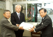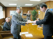 「枇杷島小の校舎新築は現在地」とする要望書を会田市長に手渡す地元代表 (2006/03/28)
