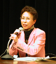 中越地震震災復興祈念講演で語る蓬平温泉の金内智子さん (2006/03/27)