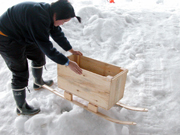 高柳町のこども自然王国で開催中の「ゆきぐにのあそび展」にお目見えした竹とりんご箱で作ったソリ (2006/01/19)