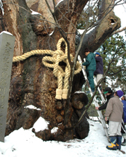 「明るく平和な年に」と新年に期待を託した大ケヤキへのしめ縄奉納=市内新道、鵜川神社 (2005/12/26)