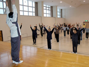 1年間の健康を願って、元朝体操を行う中央地区の人たち=1日、コミセン (2006/01/04)