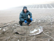 珍希生物のヤリマンボウを見つけた市内松波3の原さん=荒浜海岸 (2006/01/06)
