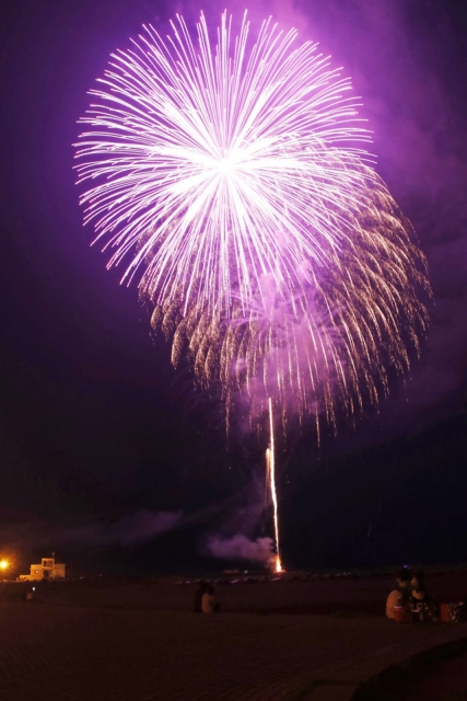 夜空に打ち上がった八坂神社祇園祭の奉納花火=12日夜、市内西港町から (2021/07/13)