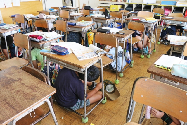 一斉地震対応訓練で身を守る行動を実践した5年生=16日午前10時、柏崎小 (2021/07/16)
