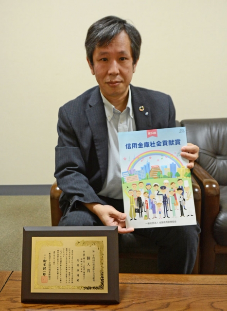 信用金庫社会貢献賞の個人賞を受けた馬場康博さん=柏崎信金本店 (2021/07/17)