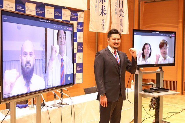 選手や審判員で東京五輪に出場するブルボンKZの5人(左から棚村、稲場、志水、津崎、小出)。記者会見で意気込みなどを語った=11日、アルフォーレ