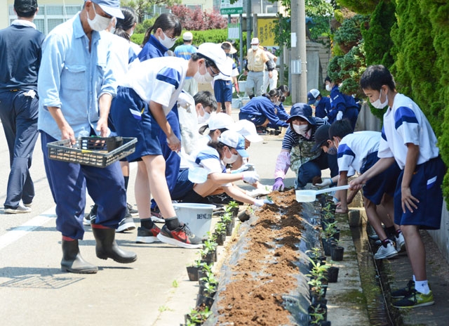 環境整備部員ら地域の人から教わりながら、花苗を植える東中1年生=田尻コミセン近く