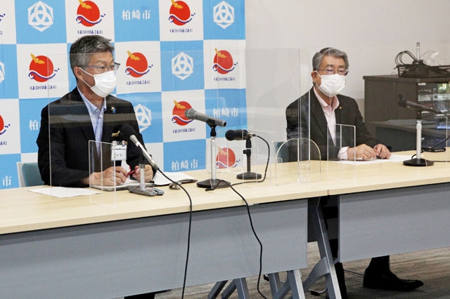 新型ウイルスワクチン接種をめぐり、合同会見を行う桜井市長と真貝議長=15日、市役所多目的室