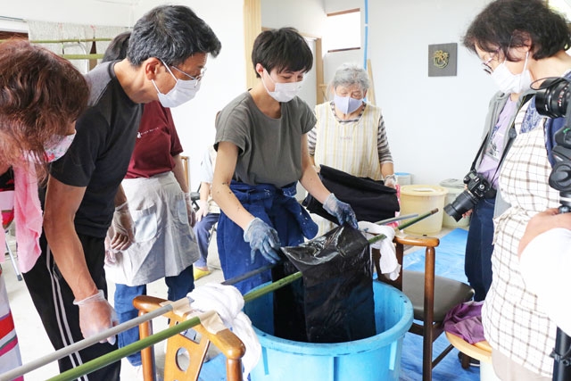 亮布作りに藍染めを重ねる山田さん(中央)と住民ら=14日、市内矢田