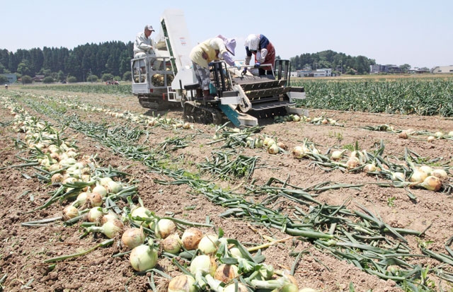 広い畑でのタマネギ収穫作業。土から掘り起こしたタマネギを専用の機械で拾い上げ、コンテナに入れていく=市内畔屋 (2021/06/19)